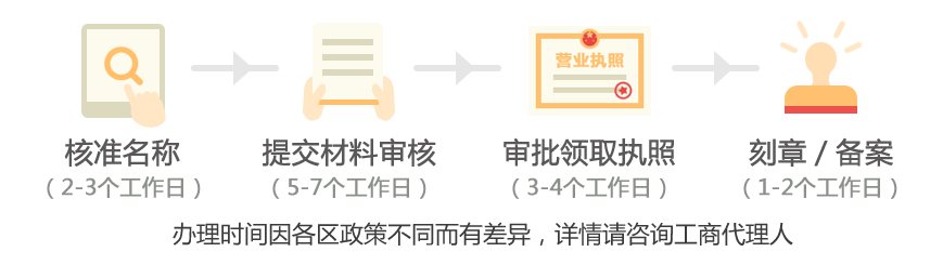 | 不同区县注册时间不同,一般15-20个工作日完成注册,具体取决于 工商局审核时间。 |